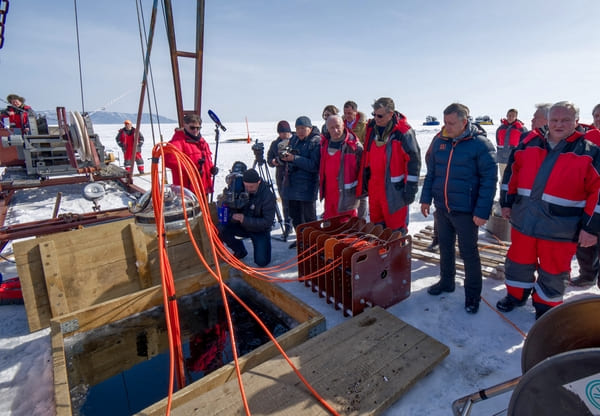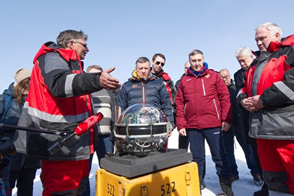 “贝加尔-GVD”于上周六(3月13日)缓缓穿过从湖冰中凿出的一个长方形孔洞,被安置在距离湖岸约4公里、水深750米至1300米的位置。