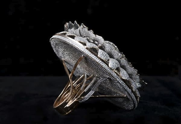 在印度文化中,人们相信万寿菊可带来繁荣和幸运,因此在班萨尔的设计中,“繁荣之戒”上面有一朵华丽的万寿菊,而戒指整体看起来也像一朵正在绽放的菊花,每一层花瓣中都镶嵌着全世界最优质的天然钻石,合计12,638颗,单是钻石重量就高达38.08克拉,而戒指总重量为165克。