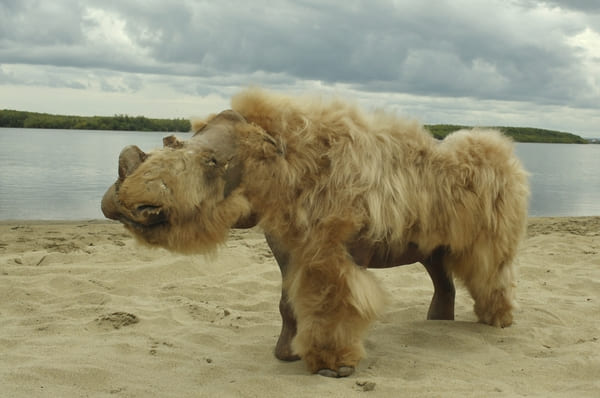 资料显示,披毛犀又名长毛犀牛,生活在更新世时期(自2,588,000年前到11,700年前)的欧亚国内北部,尤其在西伯利亚最为普遍。其大小与现存的白犀牛大小相同,体重可达5吨,身上覆盖着浓密的褐色毛发。科学家推测,披毛犀有两根相对扁平的角,比现存犀牛的角要更细,它们可以用角扫除积雪,并蚕食结霜的绿色植物簇等。