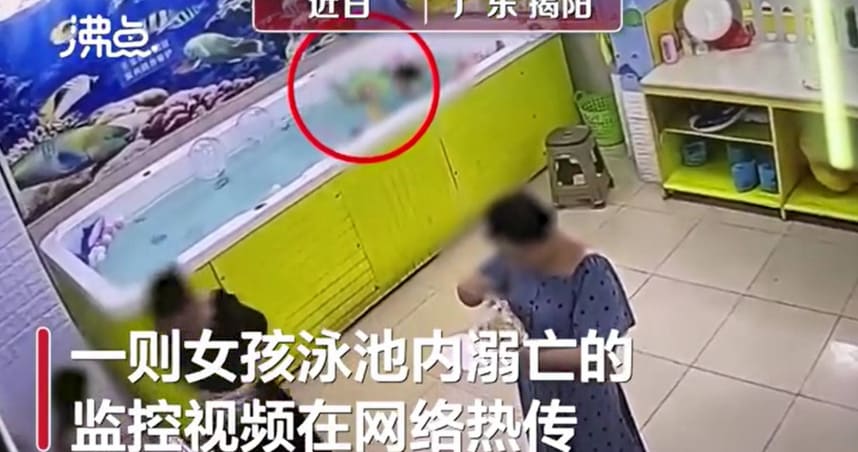 综合媒体报导,揭阳市一名母亲和阿姨上月31日带着孩子到儿童游泳馆戏水,母亲将女童放入泳池后就没多加照看,从影片可以看到,女童头部虽套着游泳圈,但她不慎头部朝下,期间曾经试图挣扎将头部浮出水面,但却一直未能成功。