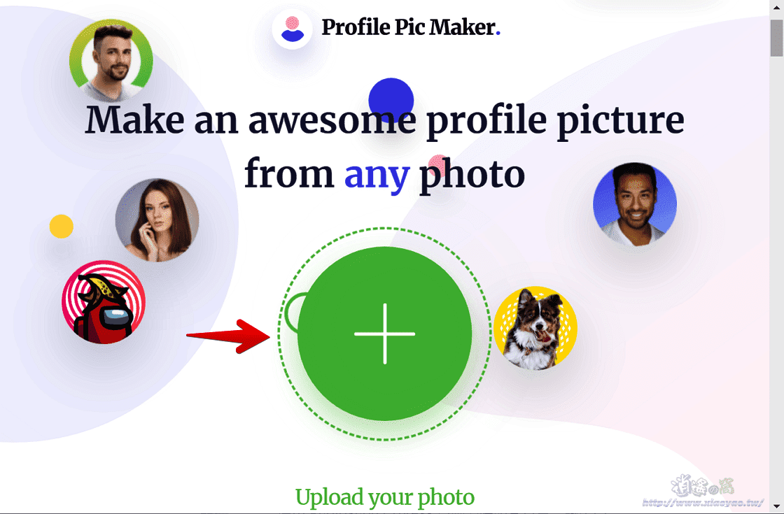 开启 Profile Pic Maker 网站,点击「+」选择一张照片,支持 JPG、PNG 格式最大容量 5MB。