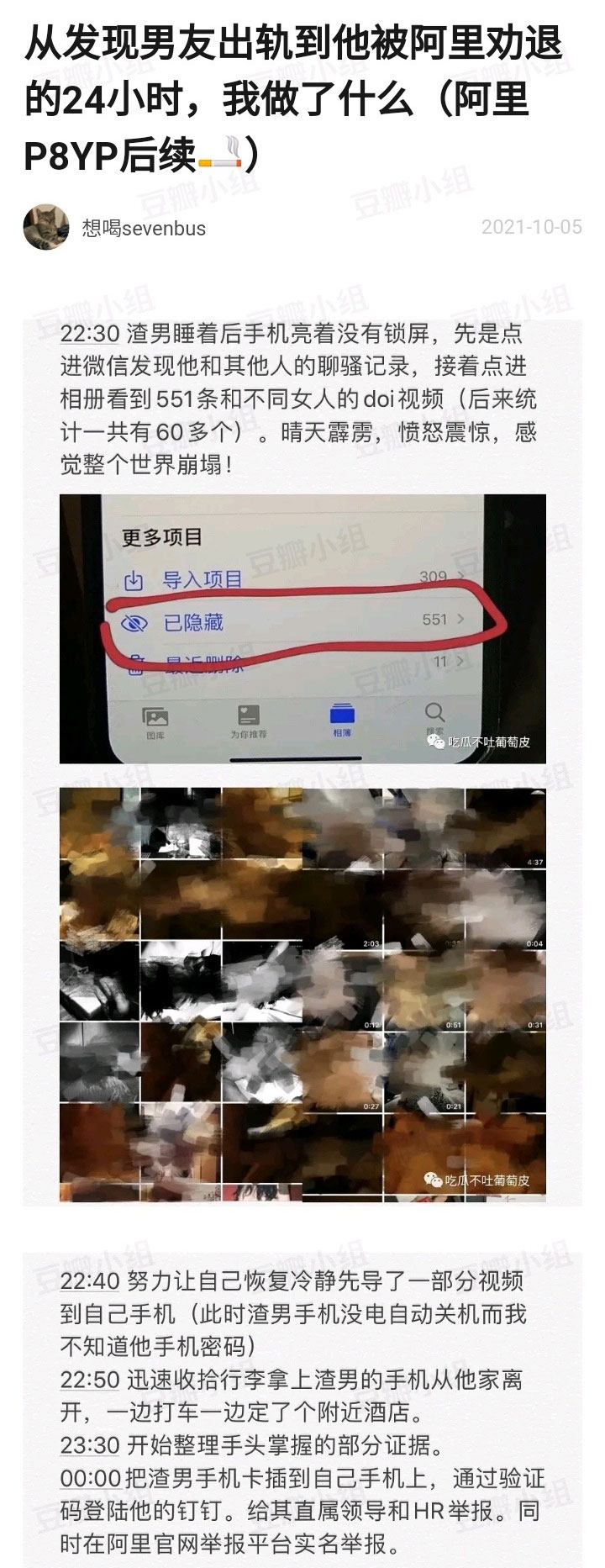 事件的起因是一位豆瓣账号为「想喝sevenbus」的小姐姐,发现男友汪某的手机里有500多条和不同女人之间的YP视频。