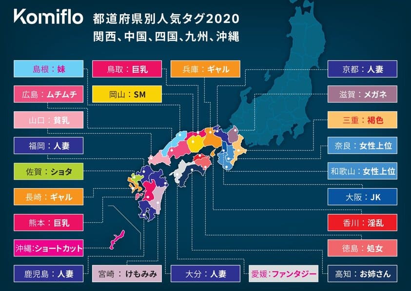 根据《Komiflo》 2020年图表显示,日本方面的热门标签包含47都道府县,其中能发现各地热门标签以「人妻」、「JK」、「巨乳」最多,而像是「淫乱」、「不伦」、「女性上位」也榜上有名,还有比较特别的标签如宫崎「兽耳」、广岛「肉感」、北海道「正太」、秋田「魅魔」等等,可知环境不同,各地人口味也不同。