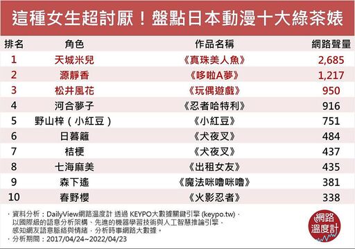 最近火红的「绿茶鉴别等级考试」大家做过了吗?你是单纯的傻白甜,还是令人发指的超心机绿茶呢?现实生活中的心机女让人恨之入骨,而在动漫中,也有不少让人忍不住想一巴掌打下去的绿茶婊角色。「童年有三婊,风花、米儿、森下遥」相信这句话从小就爱看动漫的人一定都不陌生,除了这三个人,你知道还有哪些动漫角色也是网友们公认的绿茶女吗?今天《DailyView网路温度计》就透过《KEYPO大数据关键引擎》调查,盘点出十大网路声量最高的绿茶动漫角色,一起来看看吧!