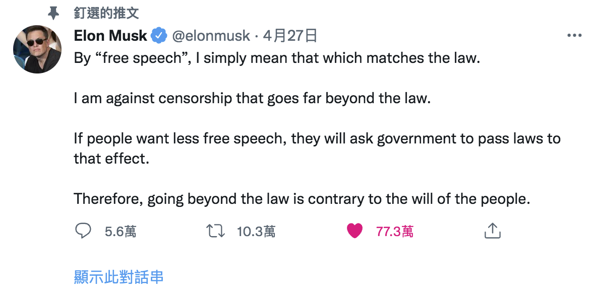 ▲ Elon Musk 透过发文谈论「言论自由」。