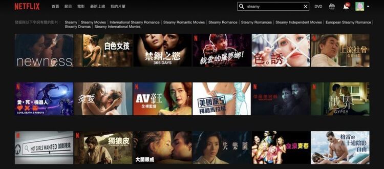 除此之外,也和大家分享,如果想找情欲类型的电影或节目,却不知道该用什么关键字搜寻,编辑传授大家一个单字就能轻松搞定!只要搜寻「steamy」,出来的结果就会是情欲系列影片,steamy本身就有色情的意味,算是一个冷知识啰!
