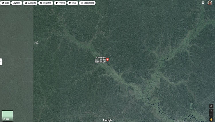网友发现在Google地图搜寻「亚马逊雨林」,画面立即会跳到南美洲巴西的亚马逊河流域,并附注「最大且蕴藏丰富物种的热带雨林」。