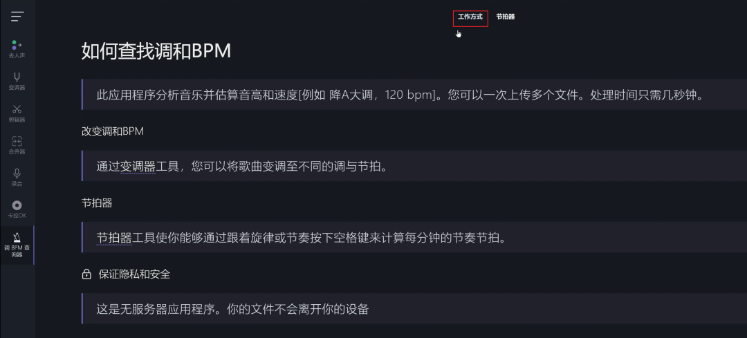 在侧边栏有音乐变调和剪辑器