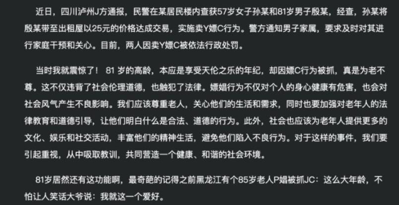 当时我就震惊了! 81 岁的高龄,本应是享受天伦之乐的年纪,却因嫖C行为被抓,真是为老不尊。这不仅违背了社会伦理道德,也触犯了法律。嫖娼行为不仅对个人的身心健康有危害,也会对社会风气产生不良影响。我们应该尊重老人,关心他们的生活和需求,同时也要加强对老年人的法律教育和道德引导,让他们明白什么是合法、道德的行为。此外,社会也应该为老年人提供更多的文化、娱乐和社交活动,丰富他们的精神生活,避免他们陷入不良行为。对于这样的事件,我们要引起重视,从中吸取教训,共同营造一个健康、和谐的社会环境。