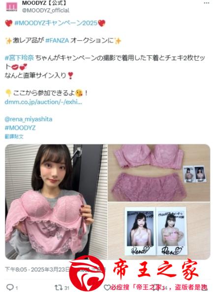这位高颜值女神《宫下玲奈》宣布在「#FANZA」贩售她的原味N衣裤!而且还是一套的,还附上亲签的拍立得,由片商「Moodyz」处理贩售,方式就是竞标,从2025年03月23日上架到网站后,目前已经截止了,结标后的售价来到96万日元!