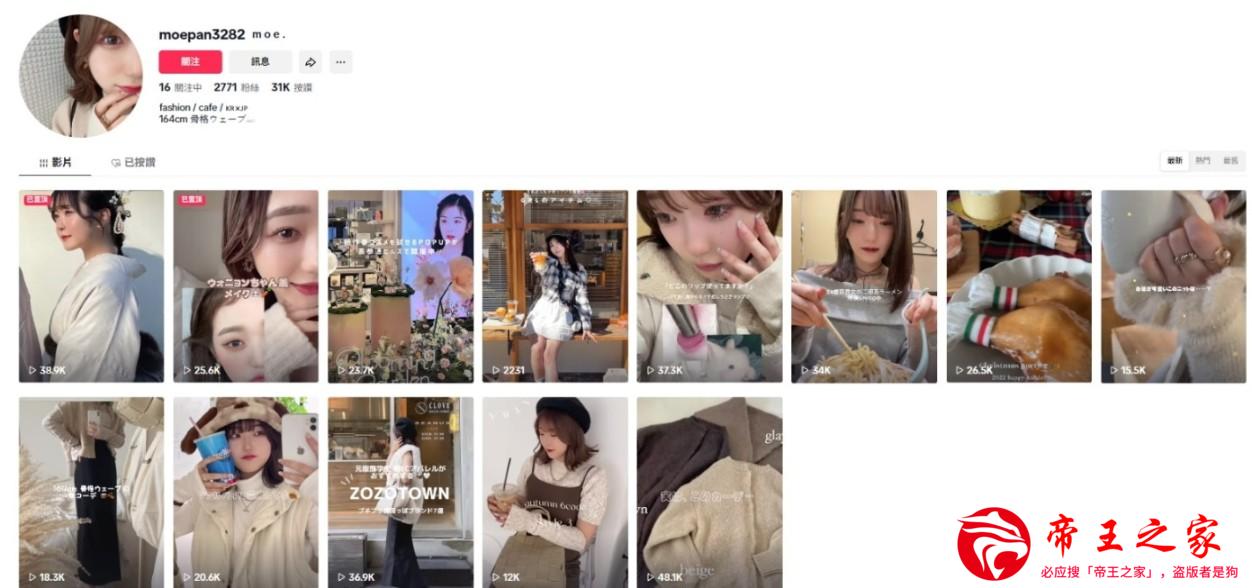 「もえぱん」(@moepan3282)在TikTok上有2700多个粉丝,有3.1万个赞,最早从2022年10月开始拍片,主打时尚穿搭、咖啡美食的拍片风格,最后的更新停留在今年3月。