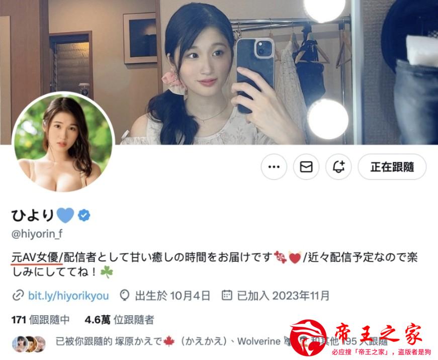 然后她发文了,说自己已经把名字改成了ひより(日和),要以直播主的身分和大家走下去,希望大家多多指教ー然后你看这个帐号,2023年11月在X注册,目前有4.6万追踪,意思是她只改了ID和名字,她是把AV女优时代的帐号直接拿来用了⋯