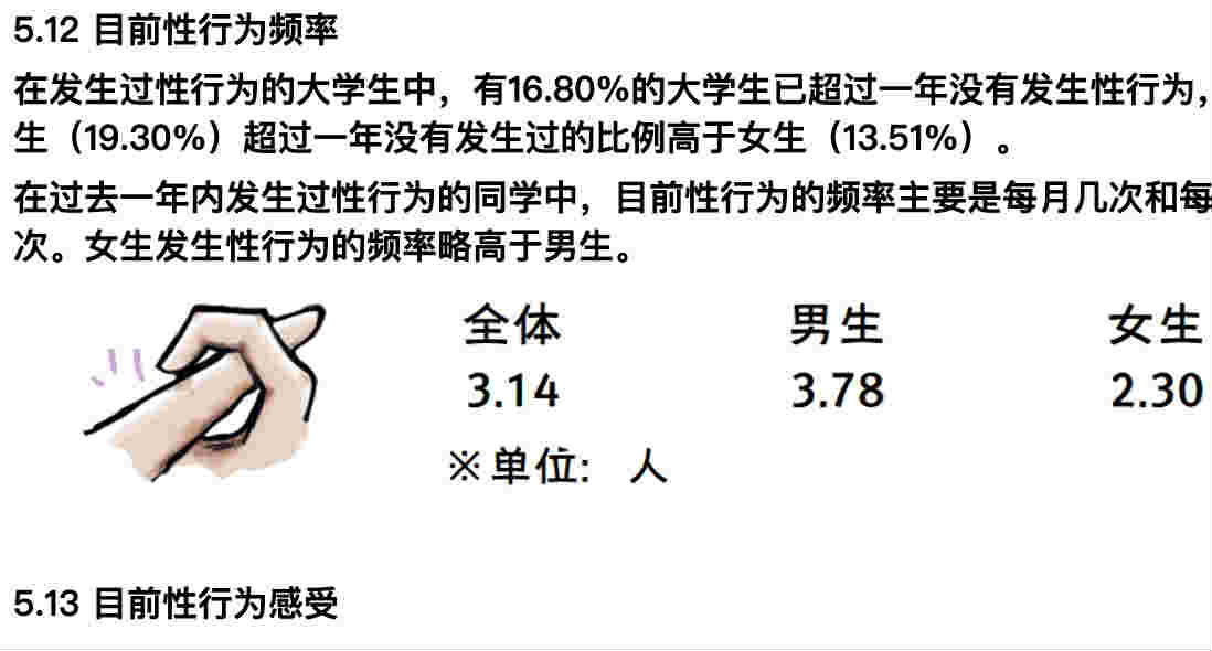 4.3 对婚前性行为的看法 4.4 对开房或同居的看法 4.5 对“一夜情”或“约炮”的看法 五、性体验与性行为篇(1) 5.1 进入青春期年龄 女生开始有生育能力的时间更早一些,比男生早了一岁。 Tips:女生来了月经,男生出现遗精,意味着有了生殖能力,是进入青春期的重要标志。青春期是以性成熟为核心的身心全面发展阶段。 男生的性需求程度明显高于女生。 随着年级的增长,大学生对性的需求也在显着增长。 Tips:性感觉、性幻想和性欲都是自然现象,并且伴随人的一生,不需要为此感到羞耻。人类天生具备享受性的能力,性是人类健康的一部分,只不过人们对性的兴趣和表达可能会随着年龄发生变化。 5.3 性自慰情况 男女生是否有过性自慰的差异明显,超过一半的女生从来没有过性自慰。 在有过性自慰的同学中,男生的性自慰频率高于女生,多数同学的频率为一个月几次。 随着年级的增长,从未有过性自慰的同学比例快速下降,性自慰的频率也在增加。 在有过性自慰体验的大学生中,男生平均在进入青春期后半年,女生平均在进入青春期后两年开始对性器官的首次自我探索。男生明显早于女生。 Tips:自慰对身体是无害的。恰恰相反,它是一种了解自己身体,帮助发泄性需求,缓解性紧张的安全而又有益的方式。关于自慰有害的种种流行说法,是缺乏科学依据的。不需要因为自慰而感到焦虑、羞愧或者有负罪感。自慰时要注意安全和卫生,不能因为沉迷而影响到日常生活。同时,自慰也是一种个人选择,不代表每个人都需要这么做。 5.6 亲密行为发生情况 超过60%的同学都有过牵手、拥抱、接吻的亲密行为,男生的发生率略高一点,但男女生没有明显的差别。从普通的爱抚开始,经历过的男生比例明显多于女生。31%的大学生发生过插入式性行为,男生显着高于女生。 随着年级的增加,各类型亲密行为的发生率都在快速上升,到大学毕业年级所有亲密行为都有超过一半的同学经历过。 Tips:身体上的享受和兴奋是人类自然的感觉,这包括与他人身体的亲密接触。人们可以通过触摸和其他亲密行为表达对他人的爱,包括亲吻、拥抱、触摸,或性行为等。 Tips:口交也可以导致多种性传染疾病的传播,如衣原体、梅毒、淋病、单纯疱疹病毒和HPV(人乳头瘤病毒)等。有专门的“口交套”等工具可以提高口交行为的安全性。 从年级上来看性行为发生情况的变化,可以看到明显的递增趋势。到大学本科毕业时,有超过一半的同学(53%)已经发生过插入式性行为。从性别差异来看,在进入大学时,男生发生性行为的比例高于女生,此后一直保持这样的趋势。但在进入研究生阶段以后,男女生之间的差异似乎不再明显。 Tips:要在充分考虑、知情同意的基础上做出关于性行为的健康、安全、负责任的决定。每个人都有权利决定什么时候准备好有性行为,以及和谁发生性行为。是否发生性行为是个人的选择,不必屈从于他人的影响或压力。基于双方自愿的性行为是健康性关系的前提。同时,做决定之前还要考虑安全措施,预防意外怀孕和包括艾滋病病毒感染在内的性传播感染。 5.8 肛门性交发生情况 只有7%的大学生发生过肛门性交,男生发生过肛交的比例高于女生。随着年级的增长,到大四年级时这一比例约为13%。 Tips: 5.9 首次性行为年龄 在已经发生过插入式性行为的大学生中,首次性行为的平均年龄在18-19周岁之间,男女生没有明显差异。 分年龄段来看,超过18岁以后性行为发生率明显增加。男女生没有明显的趋势差异。 5.10 首次性行为自愿程度 在发生过性行为的大学生中,超过90%的同学是自愿发生的首次性行为,但性别差异十分明显。男生自愿的比例明显高于女生。 Tips:基于双方自愿的性行为是健康性关系的重要组成部分。每个人都有权决定在性方面做什么和不做什么,并且应该积极地和伴侣沟通,双方达成一致。 5.11 有过的性伴侣数量 在发生过性行为的大学生中,男生有过的性伴侣人数更多,平均比女生多约1.5人。 Tips:生殖健康风险会随着性伴侣数量的增多而提高,尤其会提高艾滋病病毒或其他性传播感染的风险。保持固定性伴侣,减少性伴侣的数量,避免同时拥有多个性伴侣能够有效降低性传播感染风险。 5.12 目前性行为频率 在发生过性行为的大学生中,有16.80%的大学生已超过一年没有发生性行为,男生(19.30%)超过一年没有发生过的比例高于女生(13.51%)。 在过去一年内发生过性行为的同学中,目前性行为的频率主要是每月几次和每年几次。女生发生性行为的频率略高于男生。 5.13 目前性行为感受 大部分同学能从性行为中体会到愉悦感,比例约为85%。男生的愉悦度高于女生。相较于女生,感到非常愉悦的男生比例高出18个百分点。 Tips:性行为能够带来愉悦感,但前提是需要与性伴侣多加沟通,了解彼此的感受,在互相尊重的基础上获得并共享愉悦感受。 5.14 性高潮体验 从性高潮体验上也能看出,男生的愉悦度明显高于女生。有过性高潮体验的男生比女生多17.6%。 5.15性行为时的辅助行为和 在发生过性行为的大学生中,对于偶遇性行为,有19%的大学生实际发生过,男生显着高于女生。 5.17 偶遇性行为对象数量 在有过偶遇性行为的大学生中,男生偶遇性行为对象的中位数为3人,女生为2人。男生和女生的平均数差异显着,男生平均有过6个偶遇性行为对象,女生有3.5个。这说明有些大学生偶