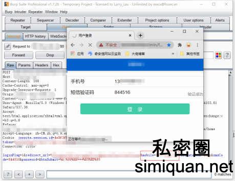 决定退出用户用burp抓个包分析分析传输的数据,输入正确的手机号验证码以及短信验证码开启抓包,可看到参数都是以明文传输的,验证码这些均与正确那我如果替换成别的用户是不是可以达到一个水平越权漏洞了呢,mobile处替换号码成功登陆别的用户斩获水平越权漏洞一枚。