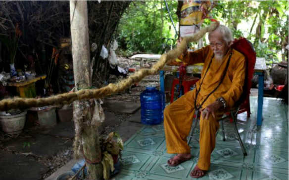 越南胡志明市 92岁老翁「战」(Chien)80年来都没有剪过头发,现在他的头发已经长达5公尺,让他感到非常自豪。被问到为什么不愿意剪头发,战强调,这是神给他的指示,自己一旦剪头发就会死,认为人不应该去破坏、改变自己与生俱来的东西。