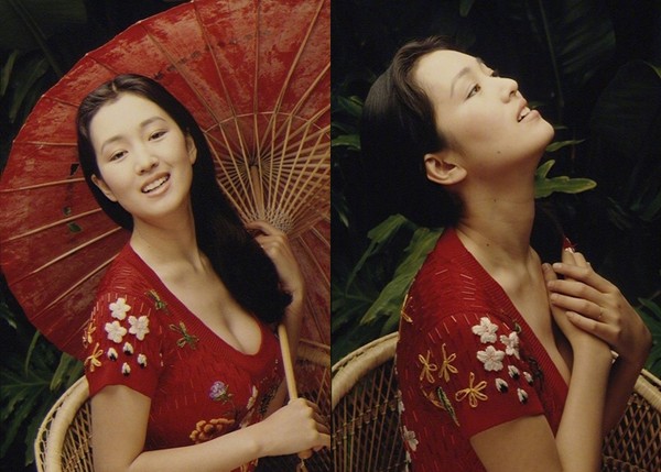 照片中,巩俐身穿一袭红色紧身鱼尾裙,上面布满缤纷的花朵刺绣,完美凸显窈窕好身材,随性垂下一头乌黑秀发,侧身转头对着镜头灿烂甜笑,纤细蛮腰令人称羡。接着,她还拿起一旁的红色油纸伞,坐在木椅上微微前倾,饱满雪乳涌出领口,浑圆双球十分性感,尽管模样青涩仍难掩星味,清新气质美也被指神似刘亦菲。