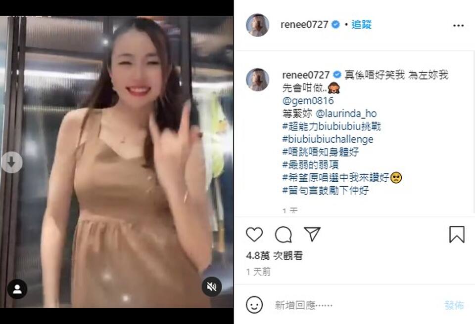 歌手邓紫棋(GEM)近日宣传新歌《超能力》,获众圈中好友跳舞力撑。除了天后容祖儿外,闺蜜歌手何超莲及李蕴都瞓身支持。李蕴IG上载影片发文道:「真系唔好笑我为左(咗)妳我先会咁做..」穿上松身连身裙的李蕴跳得十分可爱,仲有几分似大肚,孕味浓厚。