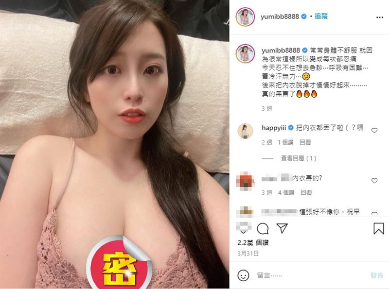 日前Yumi.k晒出躺在床上的照片,只见一双水汪汪大眼直盯着镜头,身穿粉色细肩带睡衣的她,不吝啬露出深邃事业线及一对傲人北半球,接着惊曝自己一度呼吸困难,原本要到医院挂急诊,随后话锋一转,Yumi.k竟透露「把内衣脱掉才慢慢好起来,真的无言了」,贴文曝光后,让网友笑回「这件内衣太小了,危害健康」、「太大了,小心会闷出病来喔」、「早日康复,胸罩选择很重要」、「原来是不能被束缚」留言瞬间全歪了楼。